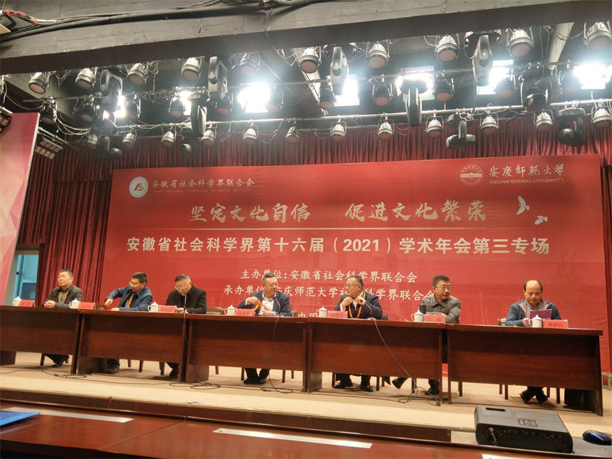 安徽省社会科学界第十六届(2021)学术年会第三专场,由安徽省社科联主办,安庆师范大学承办,全省29所高校40位代表线上、线下参会。专场围绕“坚定文化自信,促进文化繁荣”主题,秉持响应国家发展战略、聚焦地方发展实际的原则,就安徽地域历史文化研究、优秀传统文化保护、传承和发展、创新型文化强省建设、文化和科技深度融合发展等相关议题进行深入研讨。