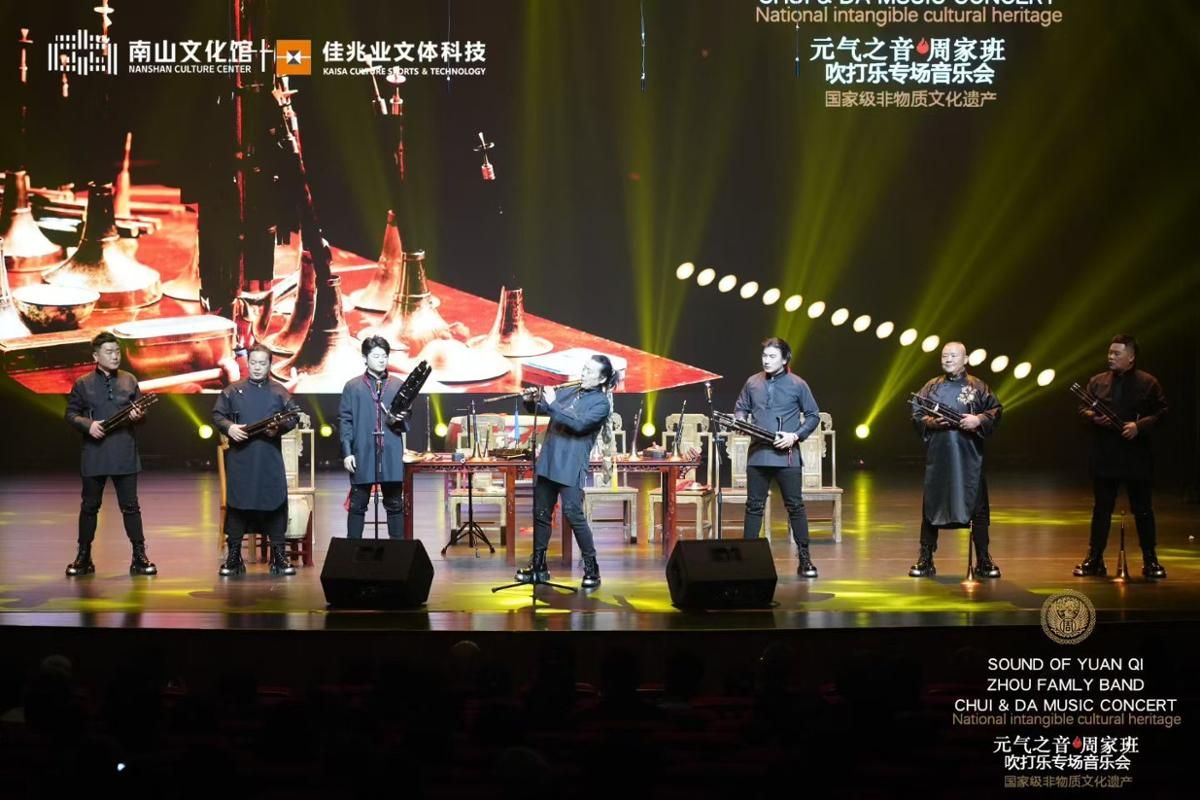 音乐会以“元气之音”为主题,分三个篇章呈现。在《梵字调》《庆贺令》等传统曲目中,周家班展现了扎根乡土的仪式音乐与生活气息;《大对棚》段落则以激昂的喇叭对奏,彰显民间艺术的蓬勃生命力。在现代创编环节,《江湖·逍遥游》《云宫神话》等作品融合武侠意境与电子音效,体现传统与当代的对话。第七代传承人带来的原创曲目《鸠兹风云曲》,展现出新生代的创作实力与演绎风范。