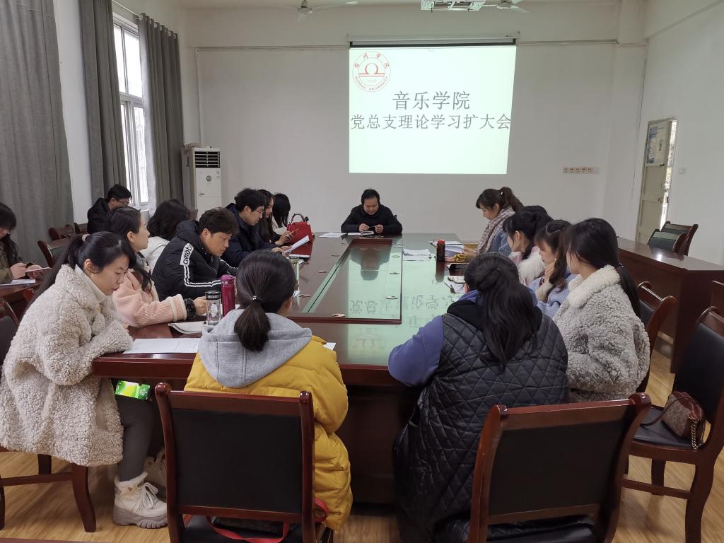 1月9日,音乐学院在艺术楼一楼会议室召开党总支理论学习扩大会议,会议由音乐学院党总支书记陈述立主持,领导班子、各支部书记及全体党员教师参加此次会议。