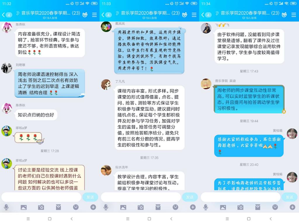 课程结束之后,听课领导及老师在音乐学院线上教学交流群里展开了讨论与经验交流。作为音乐学教研室系列教研活动之一,在音乐学院领导及老师的大力支持下,本次活动取得很好的活动效果。授课教师与听课教师均在活动中有所启发与收获。活动也为加强音乐学专业内部以及不同专业间教师的线上教学经验交流起到了良好的助益作用。