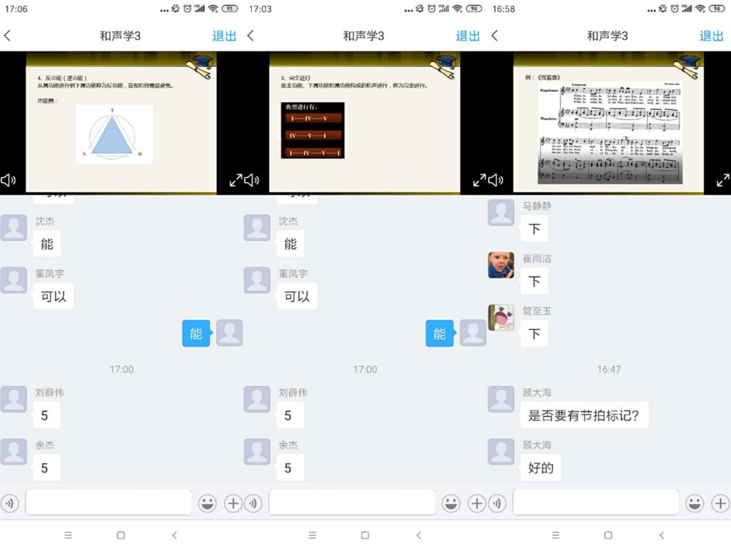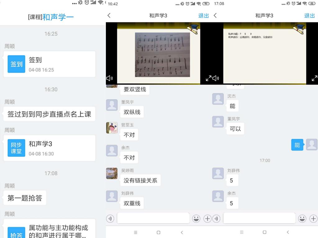 下午4点26分,伴随周颖老师发布的签到,活动拉开帷幕。4点30分,周老师准时发布了同步课堂,听课教师及同学们也即时进入同步课堂,开始了本次示范公开课的课堂教学活动。本次课的新课讲授内容是和声进行的规律。在新课进行之前,周老师首先讲评了上次课部分学生的作业完成情况,在回顾上次课教学内容的同时,对作业的准确性及规范性提出了质量要求。在同步课堂中,周老师采用课堂讲授、实时播放案例音响以及即时回复学生问题等多种手段开展了新课教学。新课内容授课结束后,又采用抢答式提问、课堂测验等教学活动巩固了本次课的教学内容。整堂课设计合理、思路清晰、讲授准确、师生互动良好,取得了很好的教学示范效果。