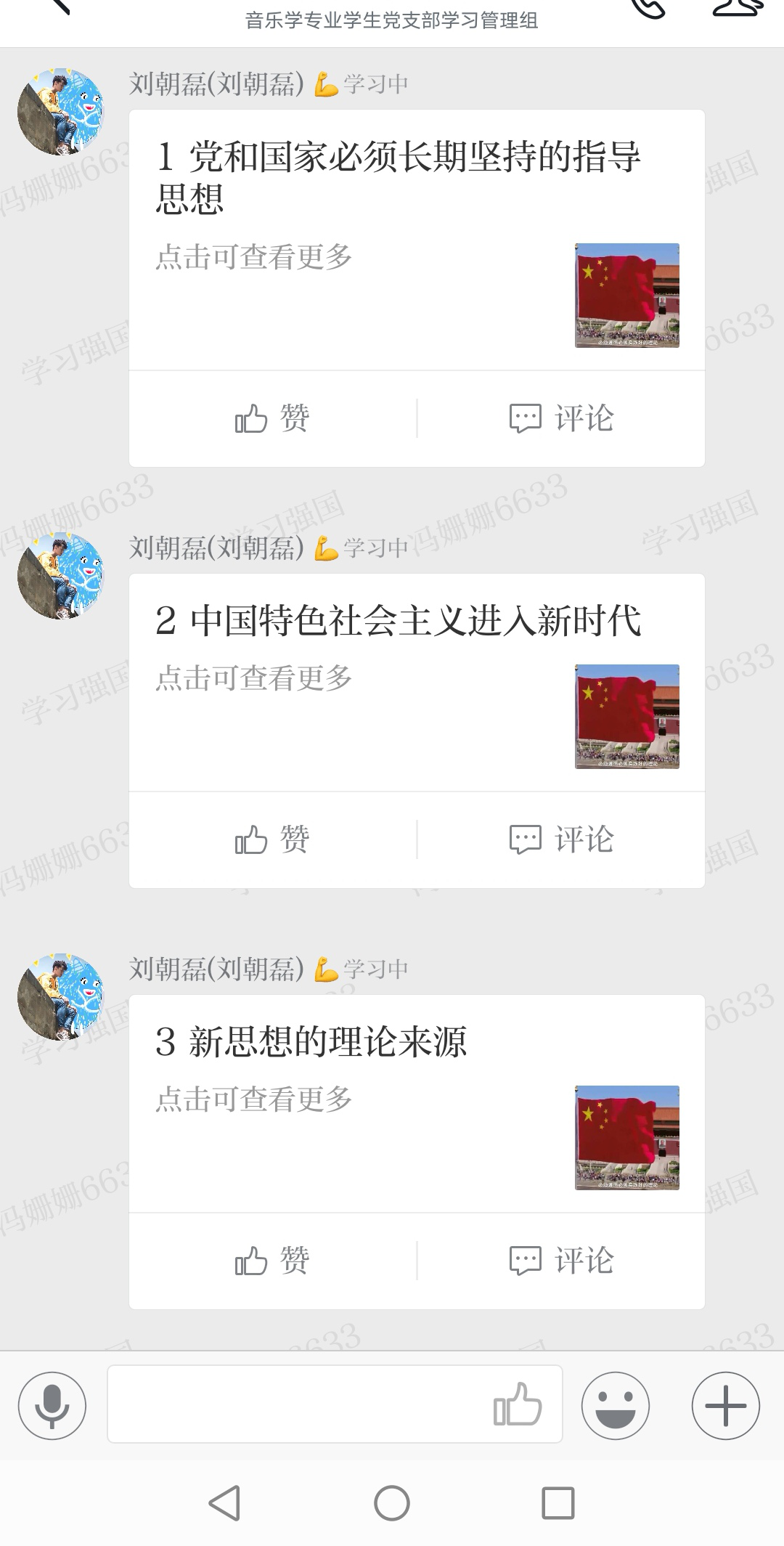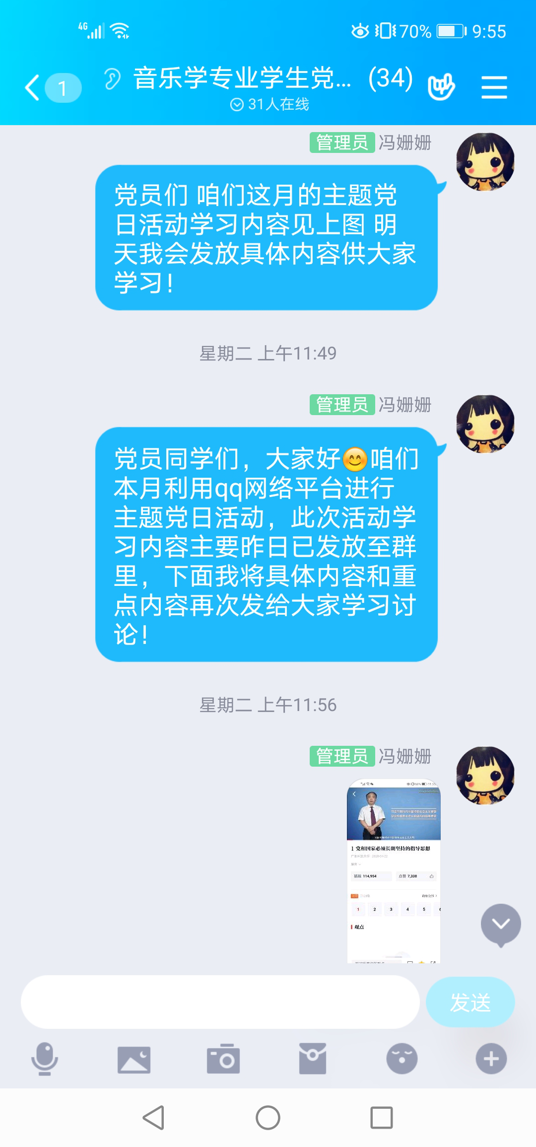 5月26日,为进一步学习实践习近平新时代中国特色社会主义思想,着力推进“不忘初心、牢记使命”主题教育常态化制度化,音乐学院音乐学专业学生党支部依托qq交流平台和学习强国软件开展5月份“线上”主题党日活动。党支部书记冯姗姗主持本次活动,党支部全体党员参加活动。