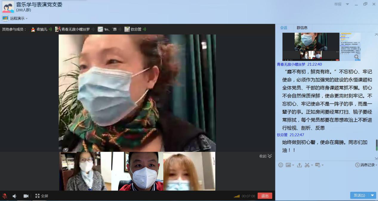 1月8日下午,音乐学院音乐学与表演专业教师党支部书记钦媛主持于一楼会议室结合QQ平台召开2020年一月份主题党日活动,重点传达学习习近平总书记在“不忘初心、牢记使命”主题教育总结大会上的重要讲话。支部全体党员成员参加了学习。