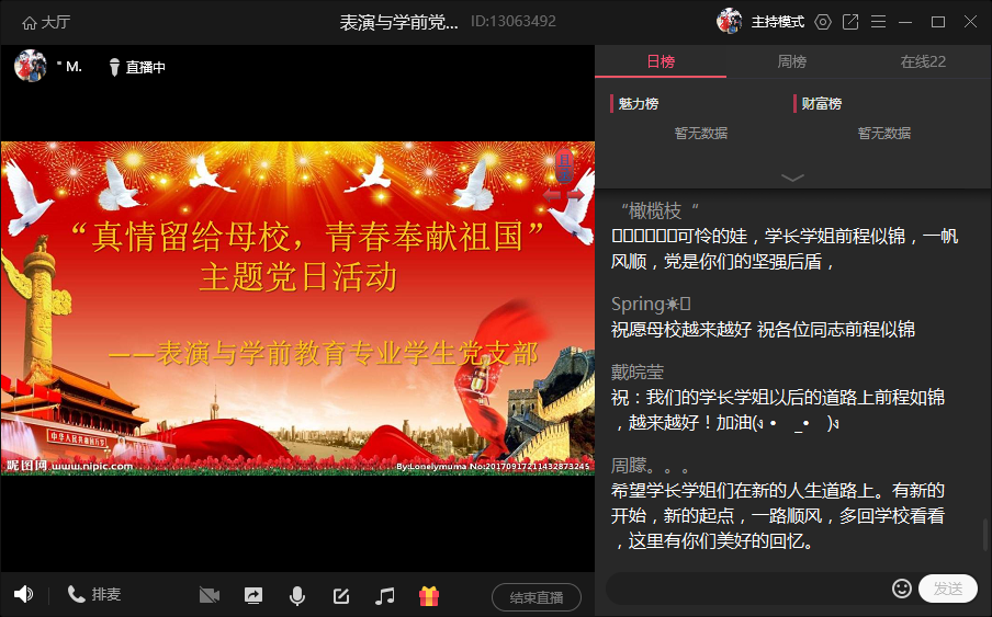 6月25日,表演与学前教育专业学生党支部依托QQ直播功能开展6月主题党日活动,活动主题为:真情留给母校,青春奉献祖国。活动由支部书记莫梦娴主持,支部全体党员参加了此次活动。