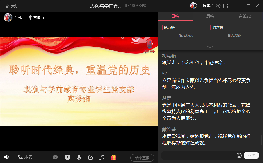 6月28日,表演与学前教育专业学生党支部书记莫梦娴依托“QQ直播”功能为支部全体党员上党课。党课主题为:聆听时代经典,重温党的历史。
