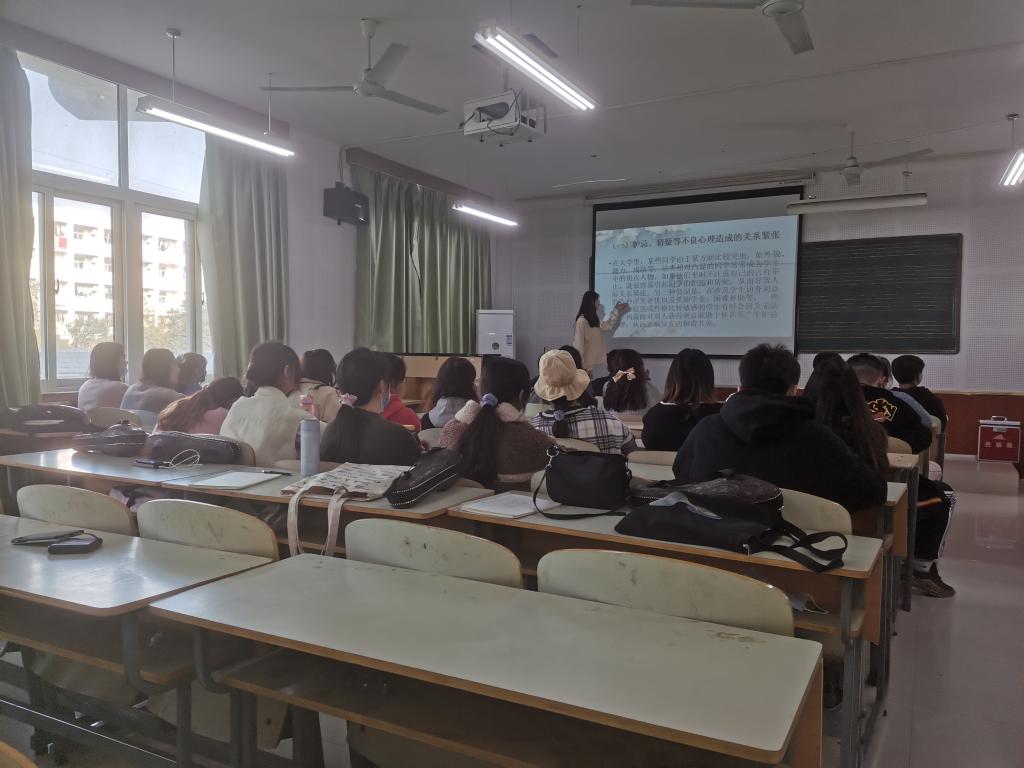 会上,各班级成员围绕着“大学生宿舍矛盾问题”与“和谐宿舍我的家”这两个方面展开主题班会。从大学生宿舍矛盾的主要形式、矛盾产生的原因以及大学生宿舍矛盾的解决方案三个方面给同学们进行详细的分析。紧接着向同学们说明了和谐寝室的重要性、构建和谐寝室的意义。