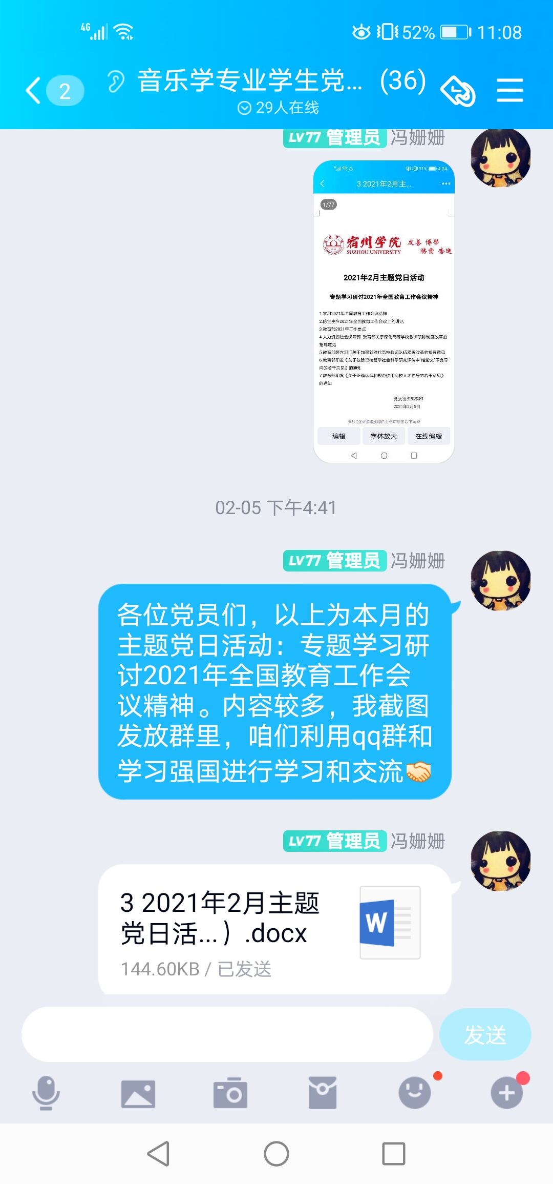为贯彻落实习近平总书记关于教育的重要论述和全国教育会议精神,切实做到党对教育工作的全面领导。2月19日,音乐学专业学生党支部组织全体党员,依托QQ与学习强国APP两个平台召开2月份“线上”主题党日活动,本次会议由党支部书记冯姗姗主持召开。