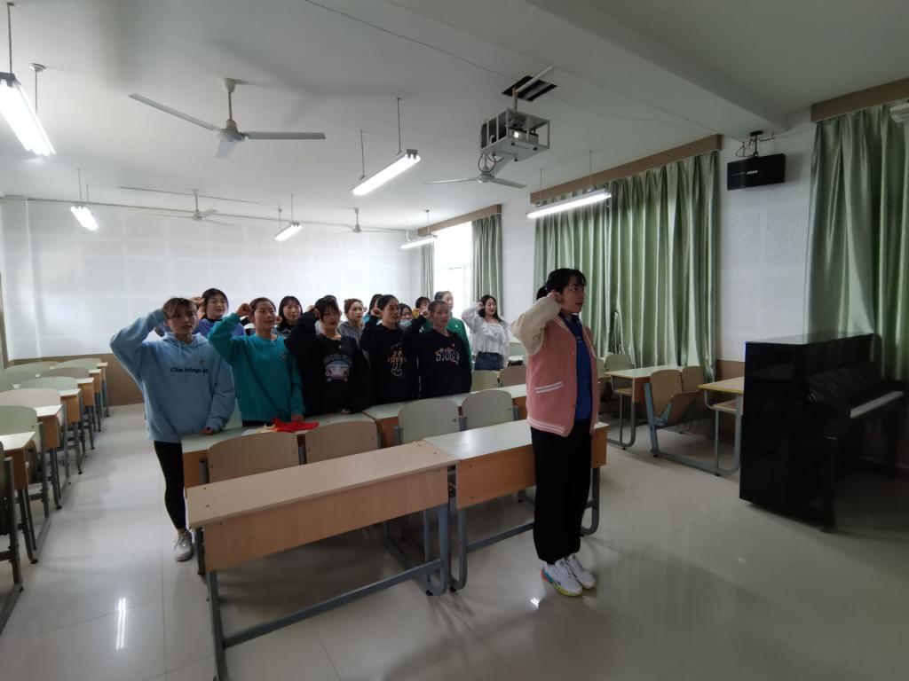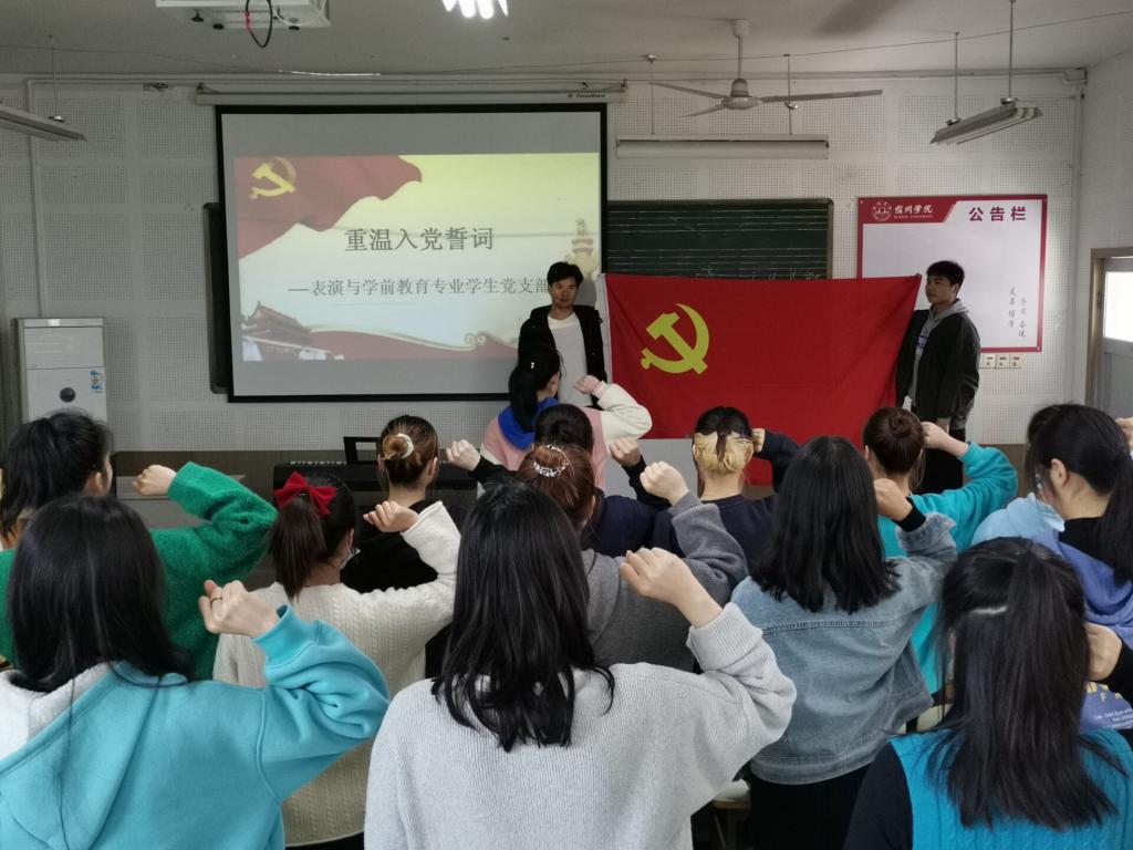 为深入开展党史学习教育,进一步增强党组织的凝聚力和战斗力,激励党员坚定爱党、信党、跟党走的理想信念,3月26日,表演与学前教育专业学生党支部在艺术楼A205教室开展了“重温入党誓词”主题活动。本次活动由支部书记莫梦娴主持,支部全体党员参加此次活动。