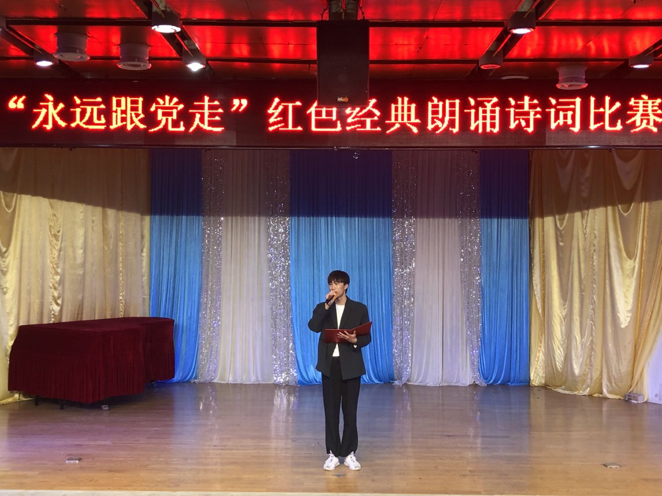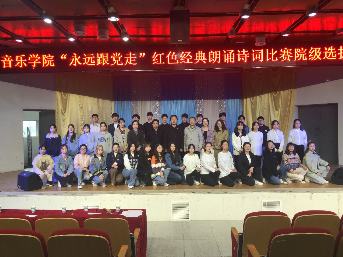 为庆祝中国共产党成立100周年,扎实开展党史学习教育,弘扬红色经典文化,更好地发挥党建引领作用,积极探索“党建+学风建设”模式,4月21日下午,音乐学院举办“永远跟党走”红色经典诗词诵读大赛院级选拔赛。本次活动由音乐学院党委主办,音乐学院团总支学生会承办,表演与学前教育专业学生党支部协办。