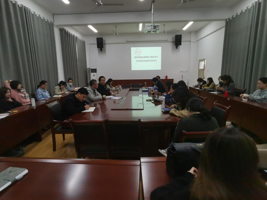 最后,徐强对本次会议进行总结。音乐学院全体教职工要认真学习领会习近平总书记重要讲话精神,坚定理想信念,秉持爱岗敬业和奋斗精神,立足本职工作,使音乐学院永葆强大的精神动力。