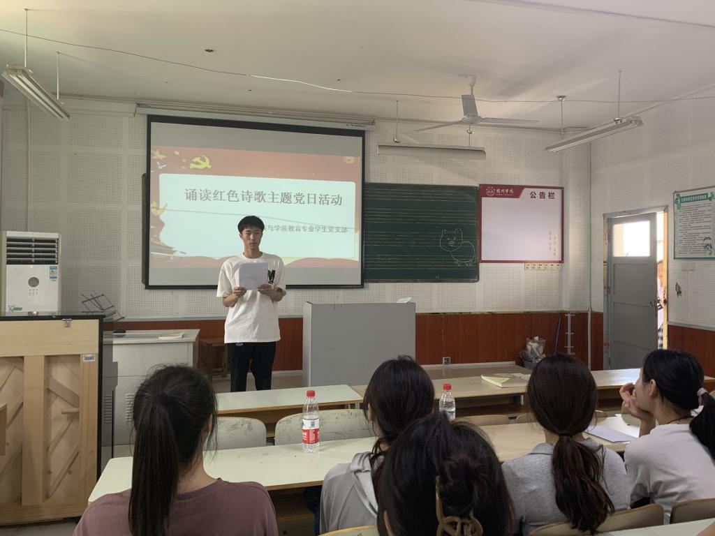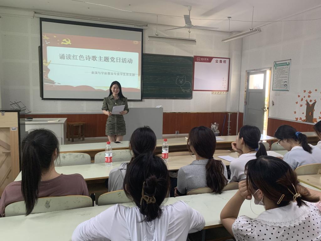 为庆祝中国共产党成立100周年,7月1日,表演与学前教育专业学生党支部在艺术楼A205开展诵读红色诗歌暨庆祝建党100周年主题党日活动。活动由支部书记莫梦娴主持,支部全体党员参加了此次活动。