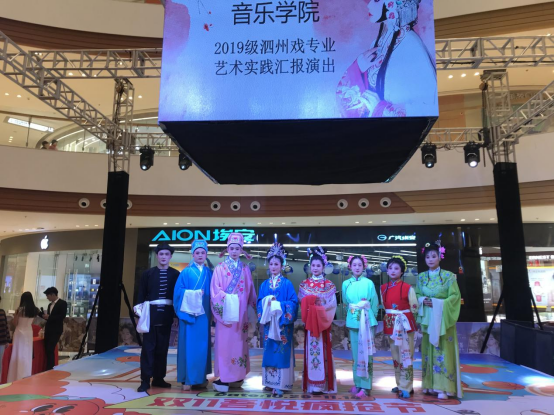 2021年10月23日下午,音乐学院2019级表演(泗州戏方向)专业同学在宿州市吾悦广场开展了“2019级泗州戏专业艺术实践汇报演出”,现场吸引了大量的群众观看,反响热烈,纷纷表示此次活动展示了宿州学院音乐学院学生的专业能力,为人民群众提供了一场艺术普及性汇演。2019级表演(泗州戏方向)的同学分别表演了《灵堂花烛》(选段)、《休丁香》(选段)、《梁祝》(选段)、《当代楷模——孟二冬》(选段)。
