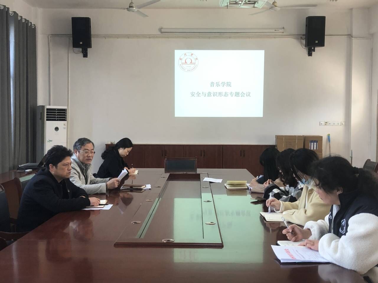 2021年11月18日上午,音乐学院在一楼会议室召开了安全与意识形态工作专题会议。音乐学院党委副书记(临时负责)徐强主持了会议。音乐学院党委副书记,院长王善虎,党委副书记、纪委书记李小娜,副院长钦媛,及全体辅导员参加了会议。