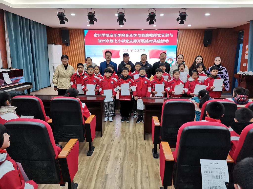 为贯彻落实中共安徽省委组织部关于印发《扎实开展“党旗在基层一线高高飘扬”活动方案》的通知要求,完成学校部署的此项工作,发挥党员先锋模范作用。12月7日音乐学院音乐学与表演教师党支部与宿州市第七小学党支部开展结对共建活动。出席此次活动的有音乐学院党委副书记(临时负责)徐强、音乐学与表演教师党支部书记刘伟、顾大海老师、刘健老师、黄慧老师、李丽娜老师、刘宁老师等新老党员,宿州市第七小学校长,党支部书记杨敬林出席活动。