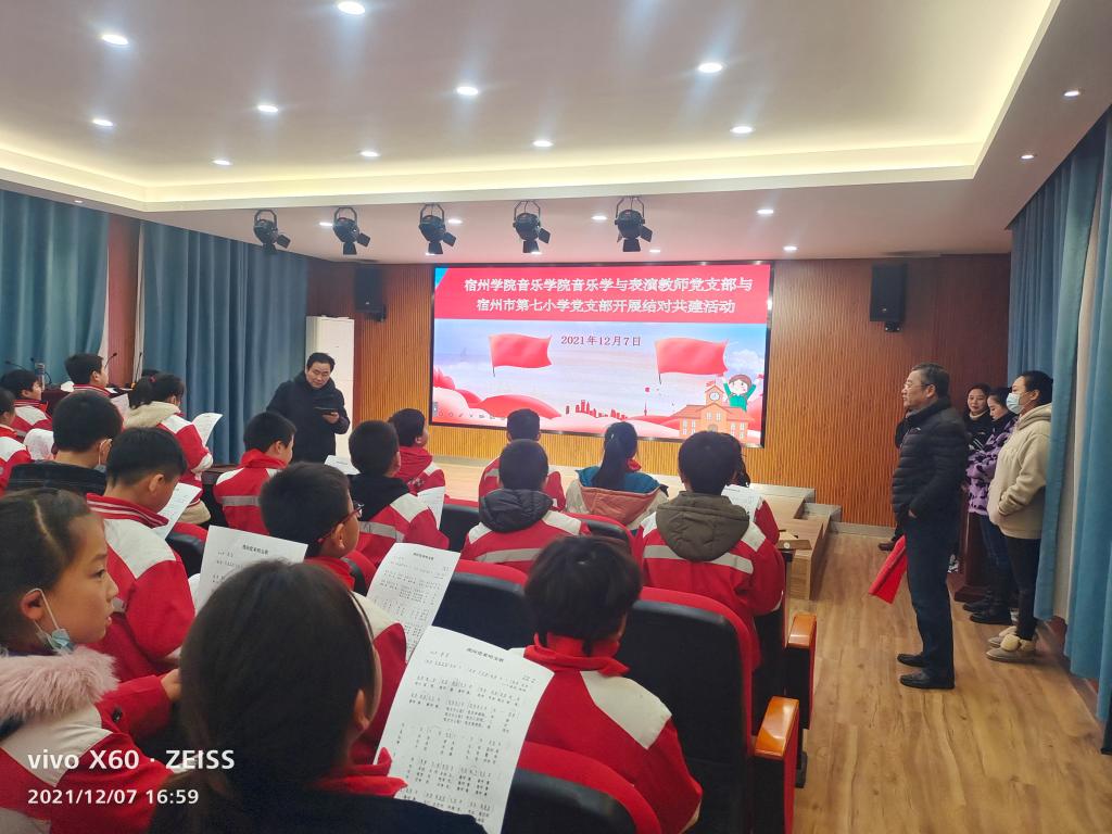 活动开始由音乐学院音乐学与表演教师党支部书记刘伟与宿州市第七小学校长,党支部书记杨敬林致辞并洽谈具体结对共建事项,音乐学院党委副书记(临时负责)徐强对具体结对共建提出了要求。活动紧接着由顾大海老师、刘伟老师、黄慧老师分别对三个班级进行音乐辅导活动,教唱了《唱支山歌给党听》、《我向党来唱支歌》,舞蹈老师则给两个班级编排了课间舞《少年》。活动持续了两节课的时间,辅导内容充实、形式多样、效果良好。