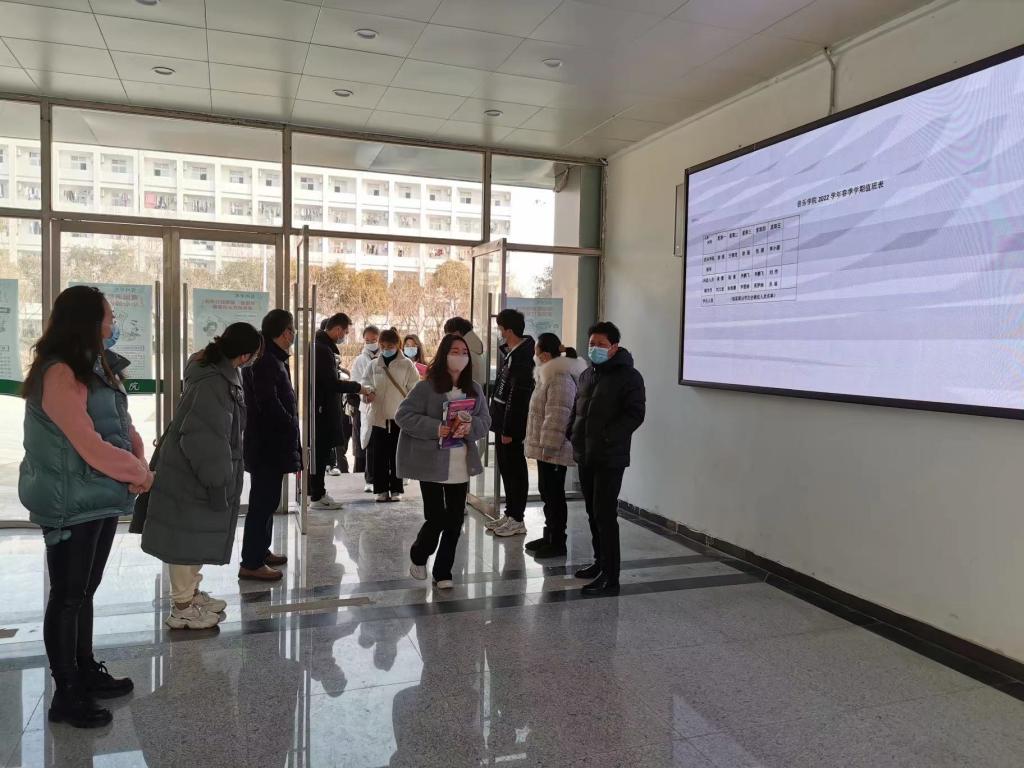 2022年2月21日上午,音乐学院党委副书记(临时负责)徐强,党委副书记、院长王善虎以及全体辅导员,学生会成员在音乐学院开展了疫情防控与教学常规检查工作。