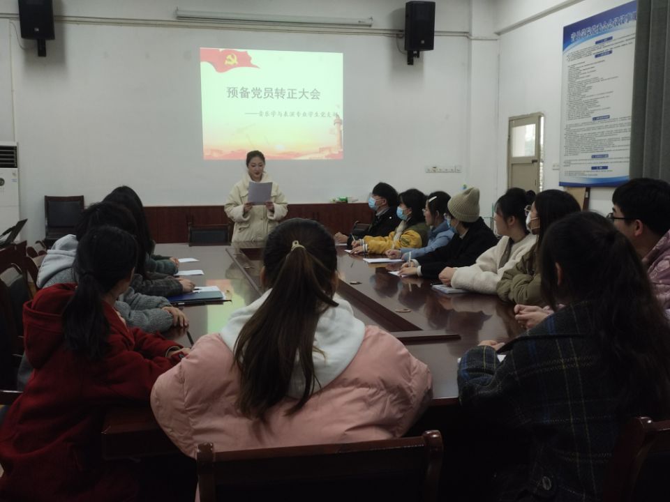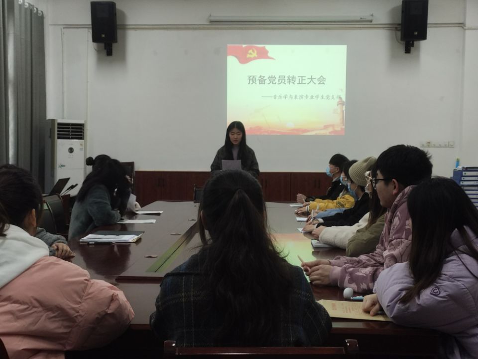 12月26日,音乐学与表演专业学生党支部在音乐学院会议室召开预备党员转正大会,会议由支部书记莫梦娴主持,大会讨论了杨飞、杨新宇、刘思伟、彭凯璐、谢紫微、郭紫倩的转正事宜。