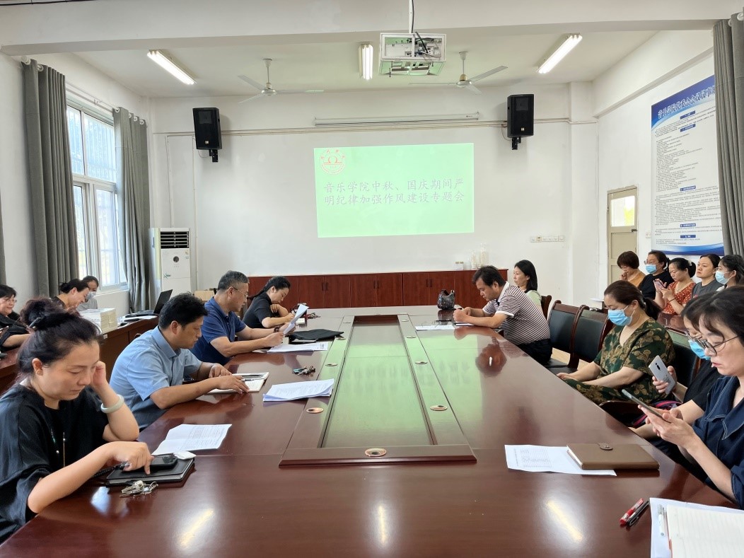 2022年中秋、国庆将至,为深入贯彻落实省委“一改两为”部署要求,进一步加固中央八项规定精神堤坝,持续巩固作风建设成果,确保节日期间风清气正,9月7日,音乐学院在会议室召开中秋、国庆期间严明纪律和加强作风建设专题会,全体教职工参加了会议,会议由徐强副书记(临时负责)主持。