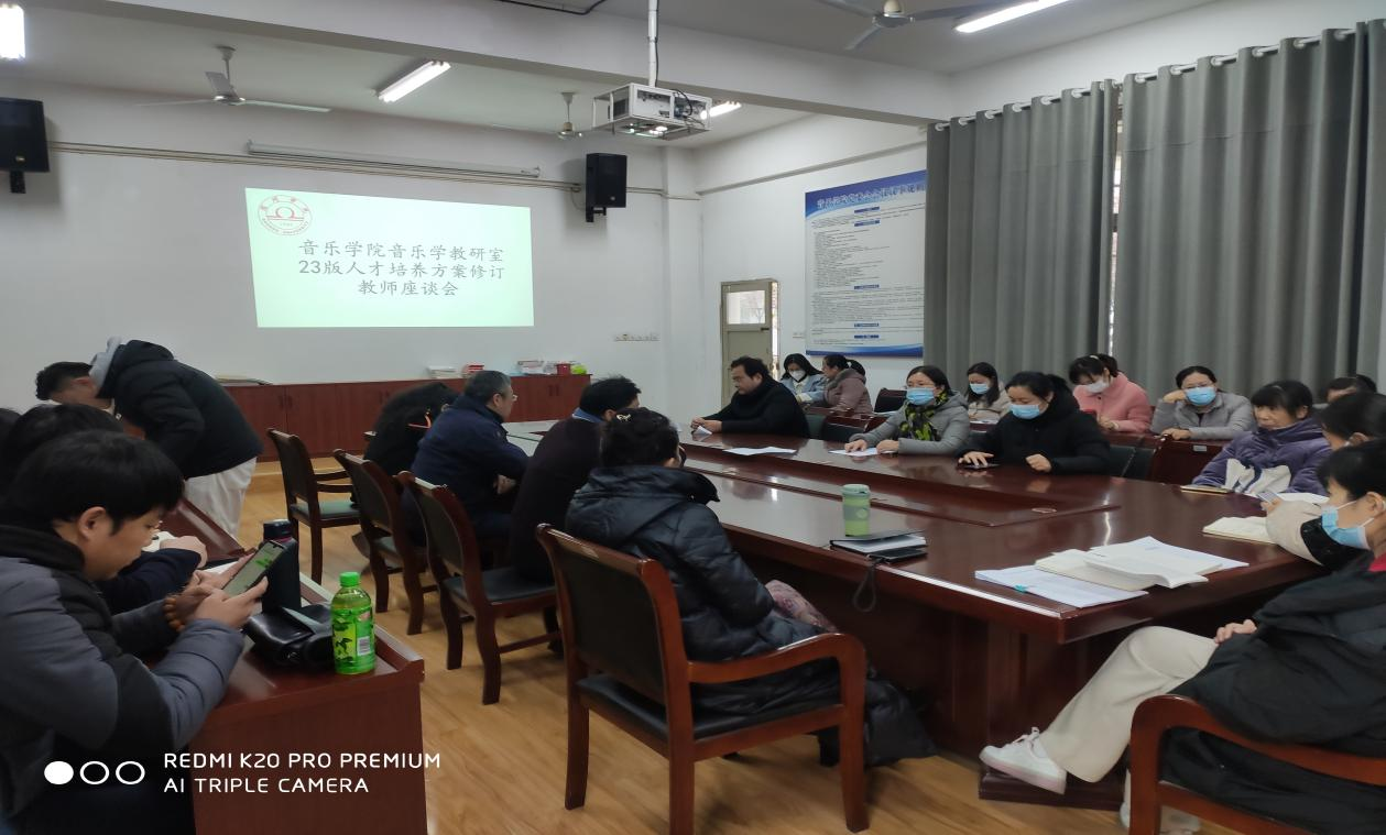 为继续适应国家高等教育改革发展要求,切实提升我院音乐学专业本科人才培养质量,11月30日下午3点半,音乐学院在会议室A106召开了音乐学专业2023版人才培养方案修订教师座谈会,音乐学院领导班子成员以及音乐学教研室全体教师参加了此次座谈会,会议由音乐学教研室主任黄桂娟主持。
