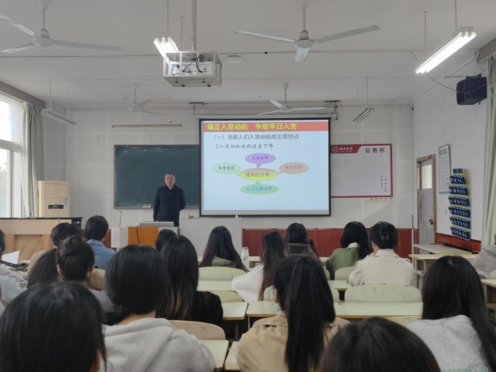 开班式在庄严的国歌声中拉开帷幕。随后徐强以《端正入党动机争取早日入党》为主题为入党积极分子上了一堂生动的党课。他强调:一是端正学习态度,加强党的理论知识的学习,坚定理想信念,在培训班期间使个人的思想政治素养得到有效提升;二是端正入党动机,主动接受党组织的教育和考验,不断取得新的成长和进步;三是坚持学以致用,积极参与实践,在实践中不断提升自己,锤炼品格,增强党性;四是发挥先锋模范爱头作用,引导身边同学向上向善,以实际行动争取早日入党。