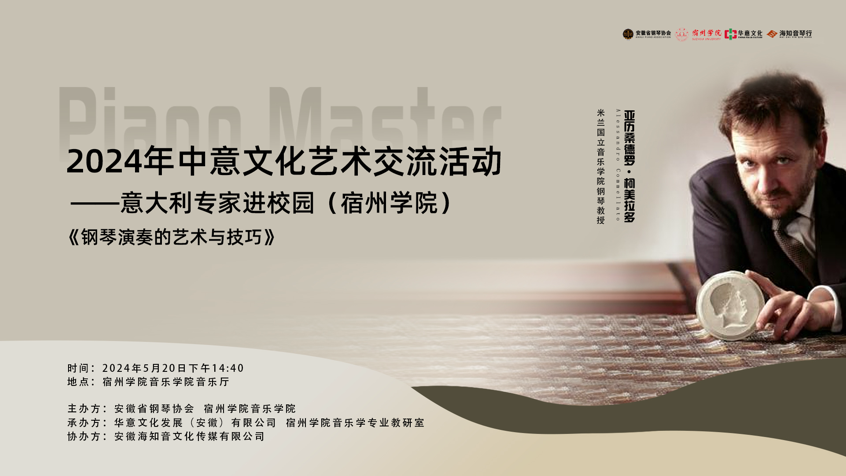5 月 20 日,一场备受期待的 2024 年中意文化艺术交流活动——意大利专家进校园(宿州学院)在宿州学院音乐学院音乐厅举办。本次活动由音乐学教研室精心承办,讲座的主题为《钢琴演奏的艺术与技巧》。