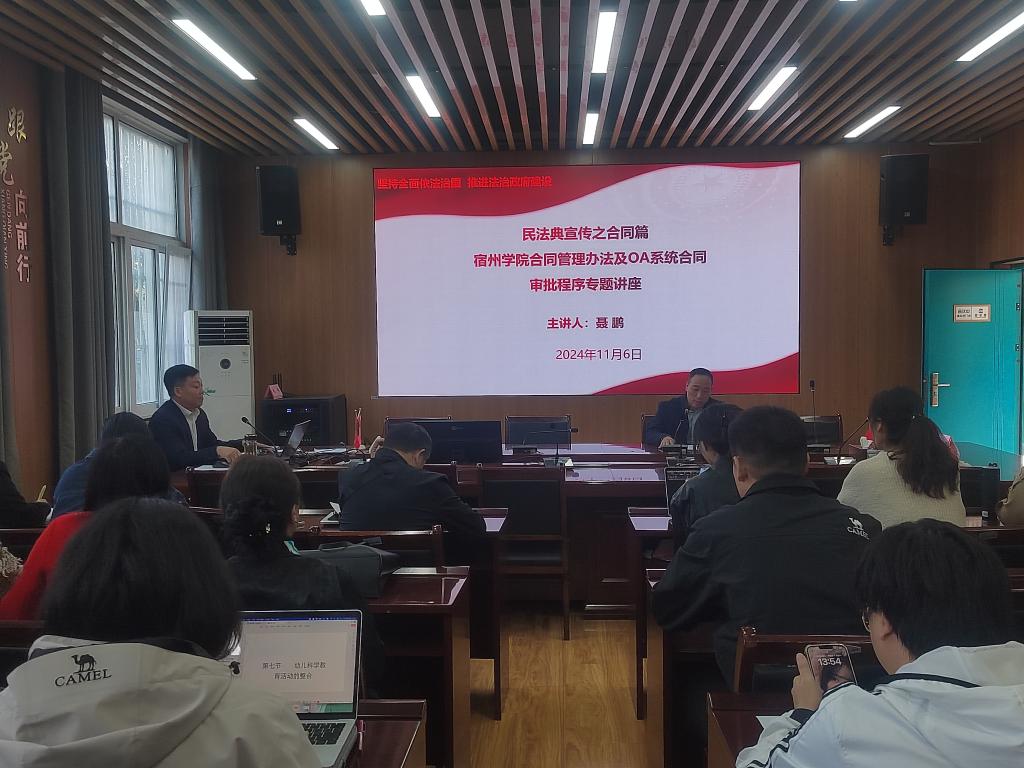 为提升我院教职工的法律法规意识,促进合同管理工作的规范开展,11月6日,我院邀请校法制科聂鹏科长作《宿州学院合同管理办法及OA系统合同审批程序程序》专题讲座。陈抗副院长主持,全体教职工参加。