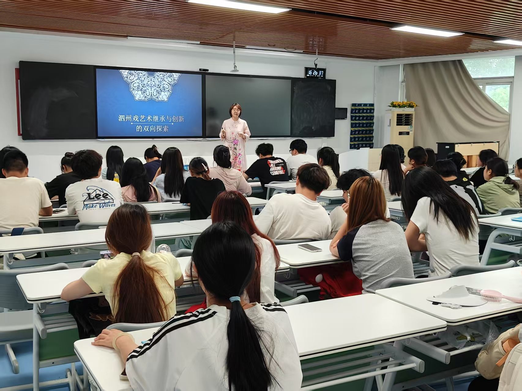 为践行习近平总书记关于新时代中国特色社会主义文艺理论的重要论述,培养和提升学生的文化自信、传承和弘扬中国传统戏曲文化及勇于创新的精神。2025年6月6日,陈美如博士在艺术楼D301为音乐学院泗州戏表演和音乐学师生开展了关于“泗州戏艺术继承与创新的双向探索”的讲座。