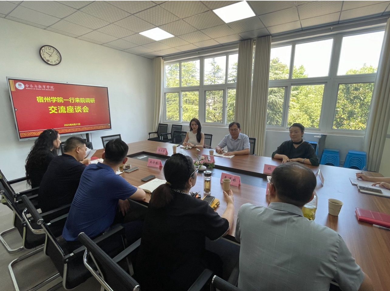 2025年8月21日,宿州学院宣传部部长岳尧、音乐学院院长钦媛、音乐学教师党支部副书记兼教研室副主任杭天惠一行赴滁州学院进行调研交流。滁州学院宣传部部长孔令十、音乐与教育学院院长李道琳、书记王诗根、副院长兼副书记高静、副院长刘海涛、教学秘书谢慧敏、办公室主任张平等热情接待我校调研组。