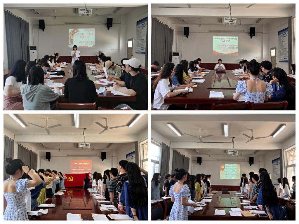 首先支部组织开展2022届毕业生党员、入党积极分子档案材料整改工作,通过自查与互查的方式对档案进行了梳理,确保档案材料的规范和完整;并对毕业生党员组织关系转接进行了说明,认真填报《2022届毕业生党员组织关系转移登记表》;随后,支部书记为毕业生党员上《奋斗正青春·筑梦新时代》主题党课,希望大家不忘初心,奋力拼搏;接着支部开展“重温入党誓词”活动,并共同重温了《中国共产党章程》中的党员必须履行的义务、党员享有的权力以及党的纪律等内容,帮助毕业生党员们明确自身的责任与义务。最后,支部组织毕业生党员齐唱《没有共产党就没有新中国》,在红歌中汲取丰富的政治营养,坚定毕业生党员永远听党话、跟党走的信仰。