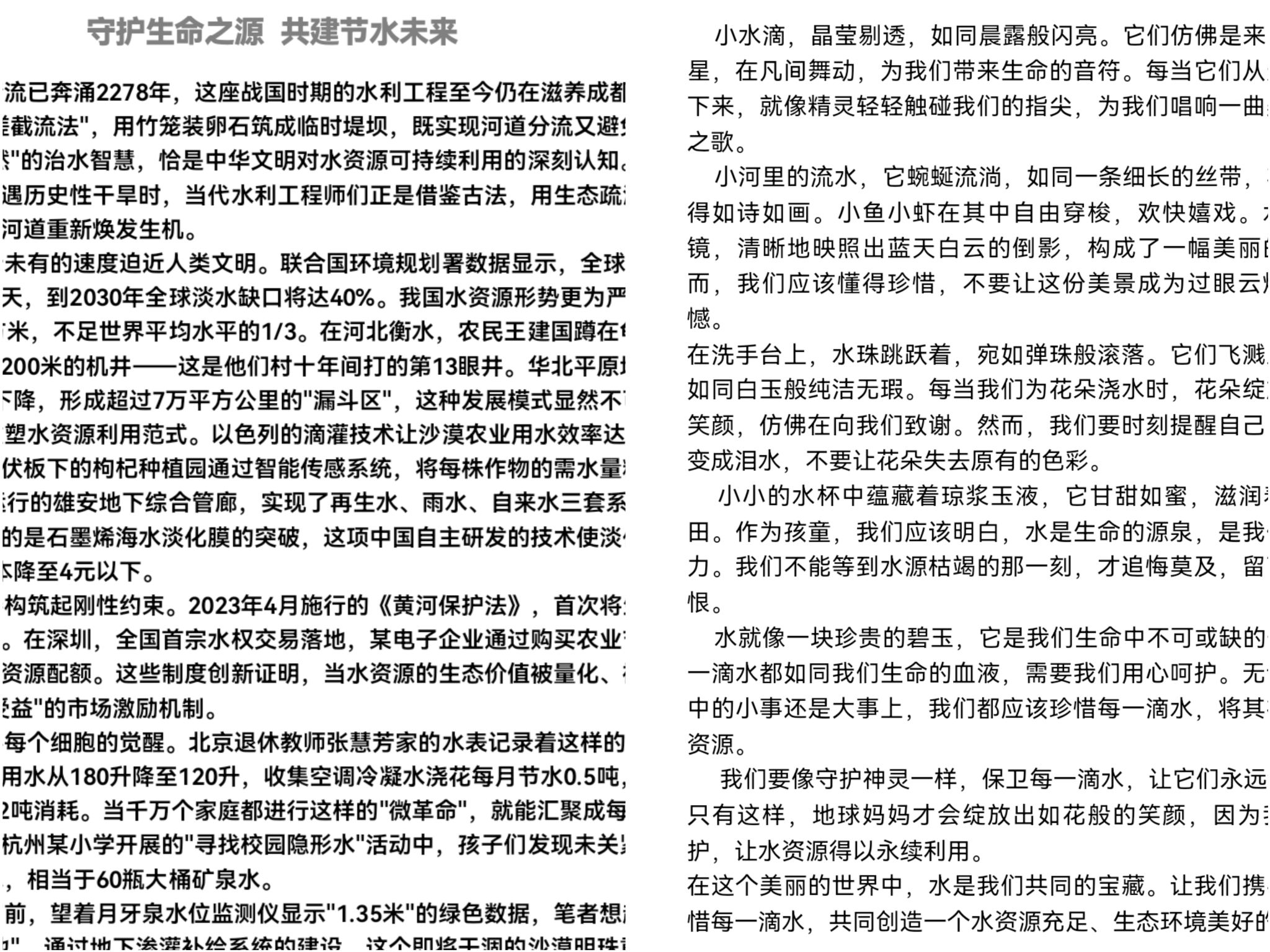 2025年3月22日是第33届“世界水日”,为响应国家节水行动号召,增强学生的节水意识,倡导绿色生活方式,3月17日——3月27日,音乐学院举办“守护生命之源,共建节水未来”主题征文比赛。