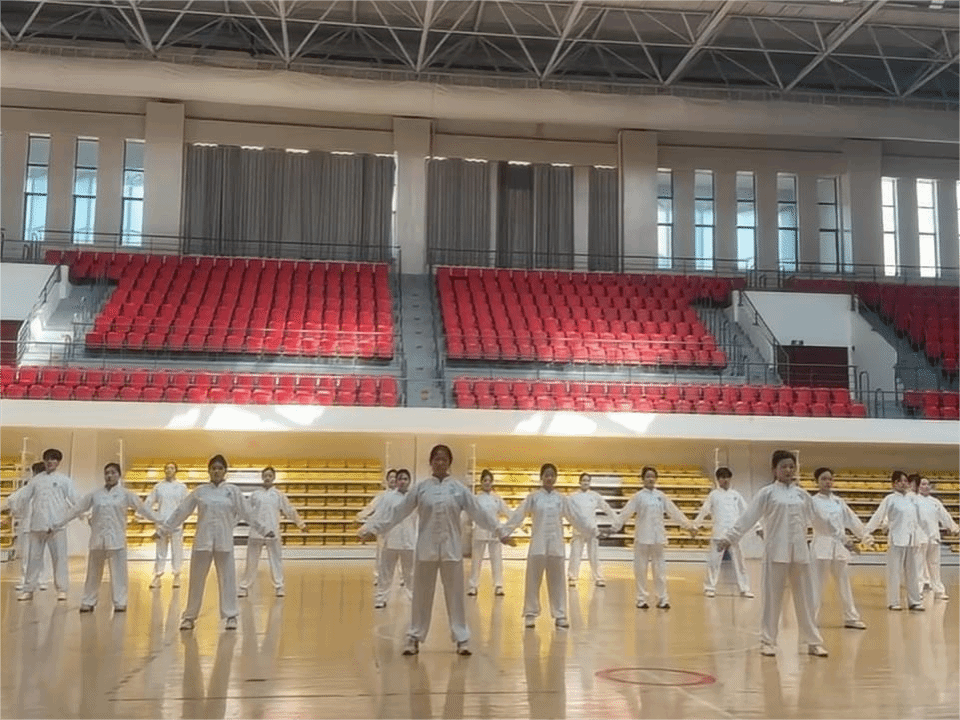 比赛过程中,音乐学院的参赛队员们身着统一服饰,伴随舒缓音乐展开动作,他们动作规范划一,起势、托举、开弓,每一个动作既展现健身气功的沉稳内敛,又蕴含着音乐的流动美感。