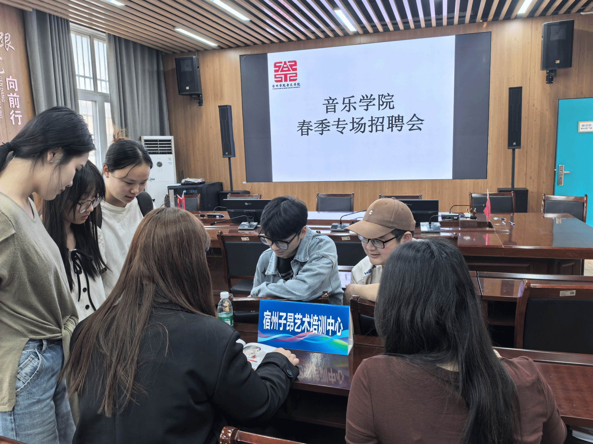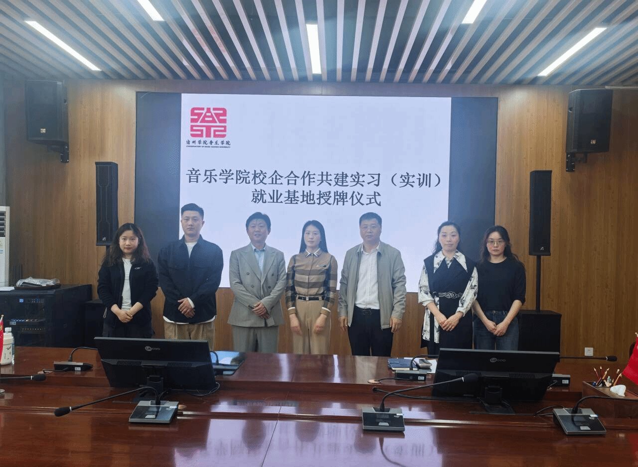 招聘会现场,王俊介绍了宿州学院的办学理念、办学特色、学科专业建设、学生实习就业等情况。根据音乐学院的专业优势,与参会的十多家企业单位的负责人交流人才需求。他指出实习就业基地的建设,不仅能更好地检验学校的教学效果,促进学生培养向深层次模式转化,更能为企业注入新鲜活力,提升市场竞争力。徐州市铜山区苏师高级中学、宿州市埇衡学校、宿州市埇桥区子昂艺术培训中心有限公司、宿州市埇桥区北辰教育培训中心有限公司的负责人作为企业代表发言,表示希望与音乐学院进一步开展深入交流合作。随后,双方签署了合作协议,并举行了实习就业基地授牌仪式。