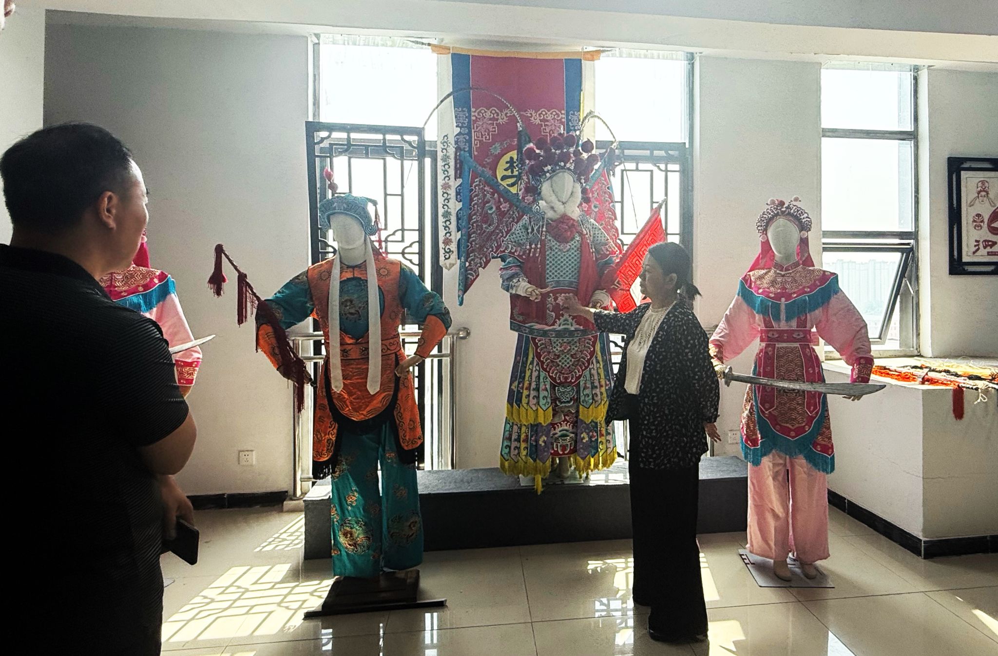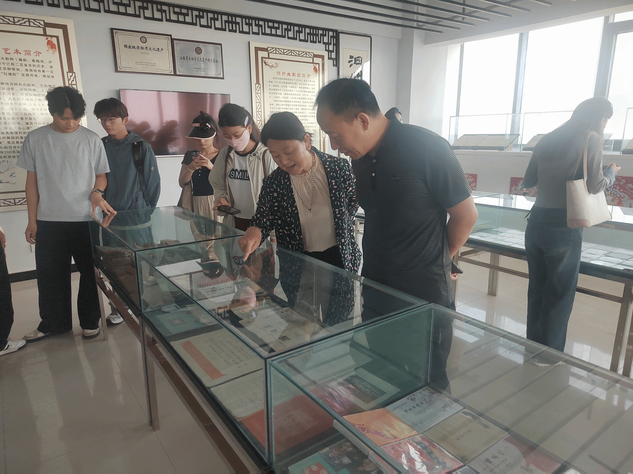 在泗州戏剧团刘莉团长的带领下,师生走进剧团展览馆,探访非遗根脉,解锁老物件与戏服中的文化密码。泛黄的剧本手稿、珍贵的音像资料、泛着岁月痕迹的剧照,生动还原了泗州戏从地方戏曲发展为国家级非遗的百年历程。此外,刘团长以“生旦净丑”行当服饰为主线,为学生讲解不同纹样、色彩与工艺的对比,剖析不同角色的人物性格与艺术表达。使学生了解戏服不仅是舞台的语言,更是角色灵魂的外化,深刻体会“服化道”对戏曲表演的支撑作用。