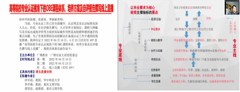 为进一步加强我院教师对学前教育师范生专业二级认证工作的理解,提高认证工作的 质量与效率。音乐学院副院长钦媛、学前教育专业教研室主任张素枝、学前教育专业专任教师李丽娟参加了于 2022年04 月 16日、4月23日在钉钉APP直播“高等院校专业认证视角下的OBE课程体系、培养方案及自评报告撰写线上直播”培训活动。